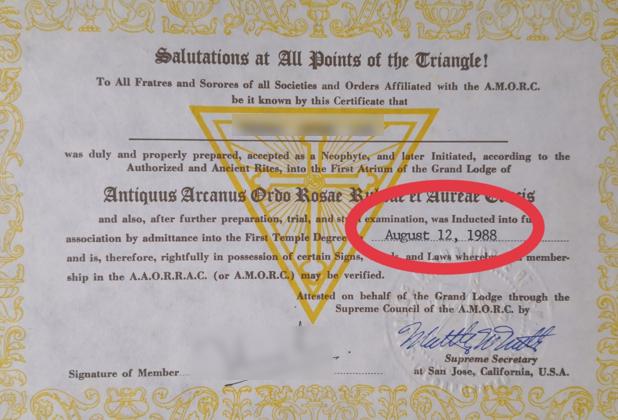 “1988 年我是玫瑰十字会兄弟、 1991 成为马丁会兄弟,两者和共济会乃至光明会属于同渊源传承,无法分开,无论传承、架构、仪式、气氛都差不多,我不是共济会成员,不过认识很多悉尼共济会兄弟,既被邀请进入过建筑内部,也被邀请过成为兄弟”。