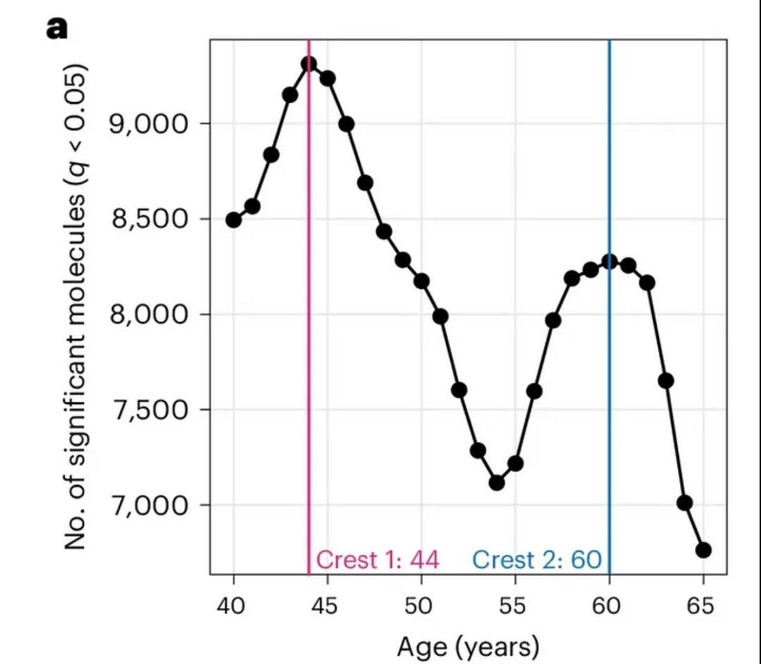 2024年8月,《自然-衰老》杂志发表了一项研究。该研究分析分析了不同年龄人群体内大量蛋白质和代谢物。综合来看,人体化学成分会随着时间发生一些重大变化——而在44岁和60岁的时候变化是最大的。看来我不该质疑夫人的才华啊。