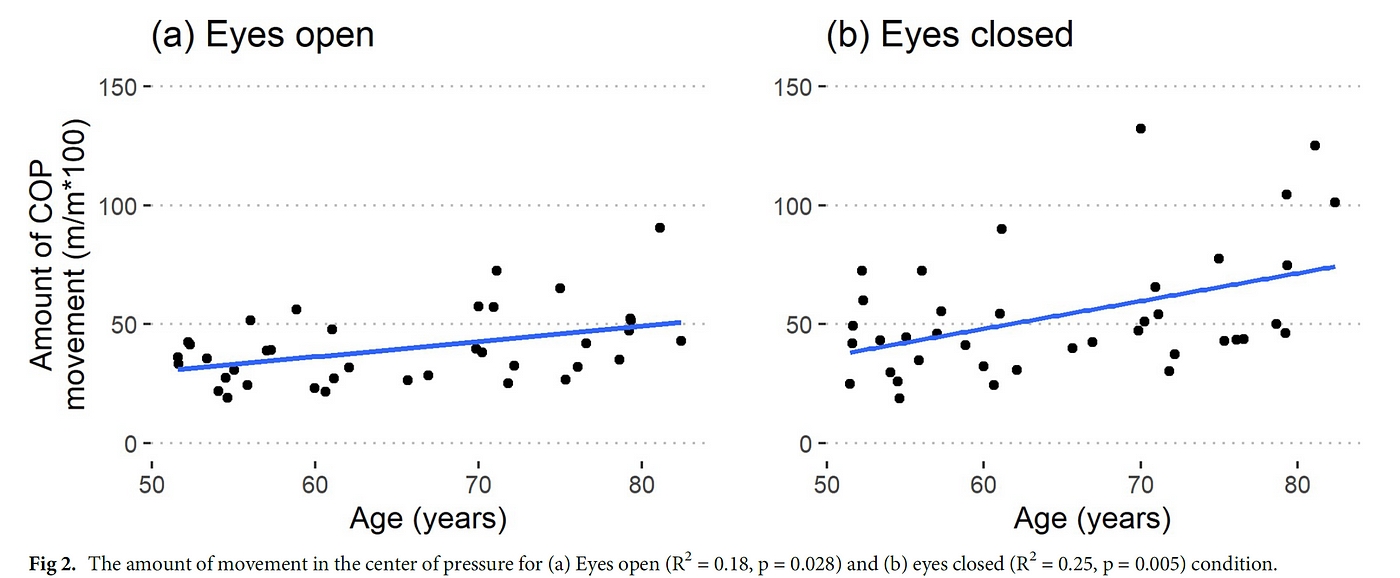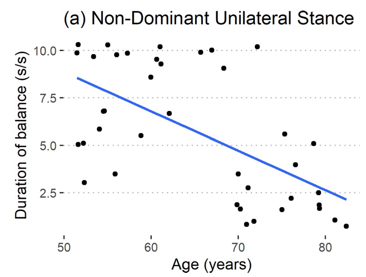 此外,研究中使用的相关系数暗示了某种线性关系,但从原始数据来看,数据点似乎并非严格线性分布。正如我前面提到的,在65岁左右似乎存在一个显著的急剧下降。因此,这可能没法用来作为随着身体逐步老化而缓慢变化的敏感性测试,这个更像是突然发现自己的平衡能力有所衰退了。这种情况减少了我们提前进行干预的机会。