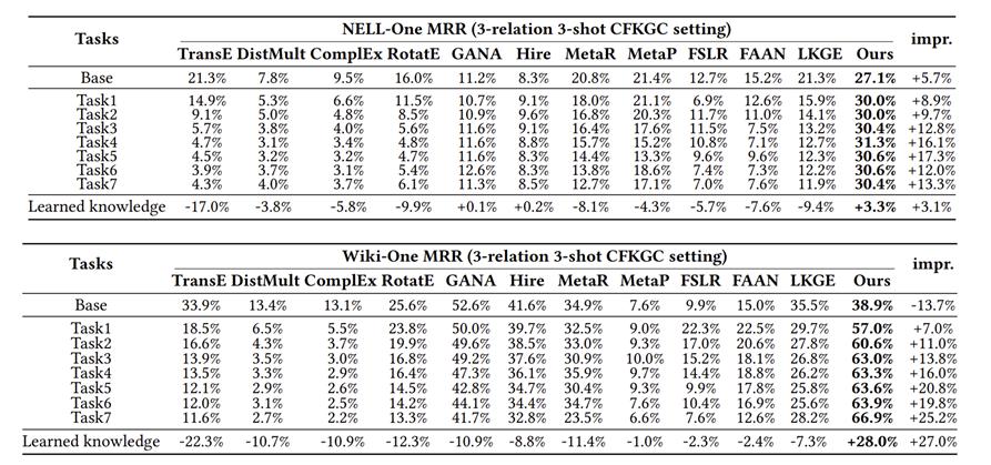 就拿NELL-One数据来说,与第一个task(11.1%)相比,MRR指标在最后一个任务中显示了11.35%的性能,在此期间最高可达12.55%。