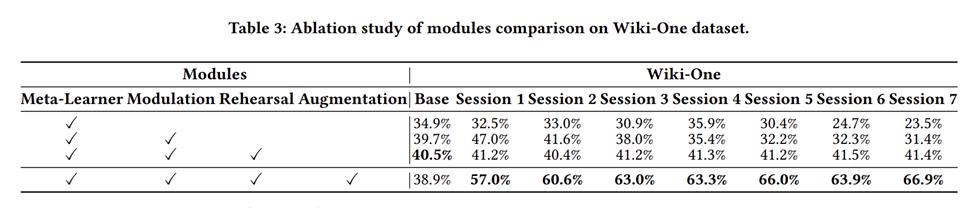 在Wiki-One数据集中,从基线的38.9%增加到最后一个任务的40.05%。与其他方法相比,随着更新知识的学习,样本的性能也在下降,模型完成了更好的样本学习特性的维护。