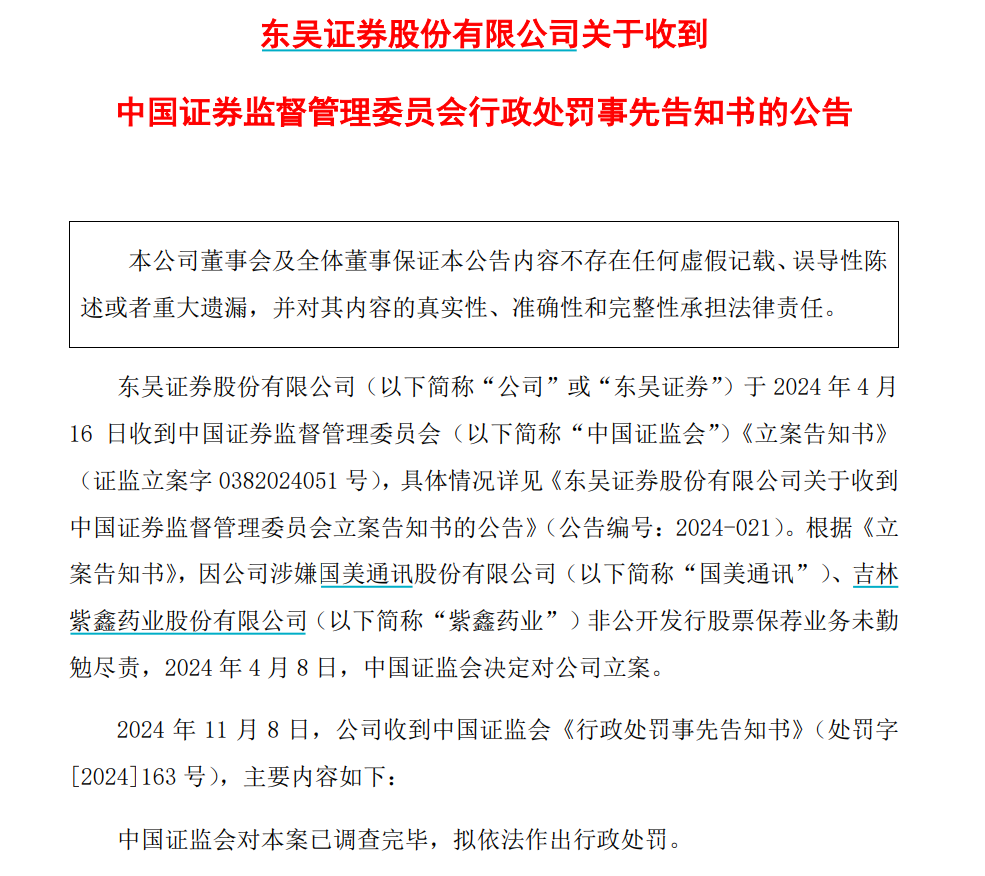 11月8日晚,东吴证券宣布收到证监会《行政处罚通知书》。东吴证券涉嫌国美通信、紫鑫药业非公开发行股票保荐业务,证监会对此案进行了调查。