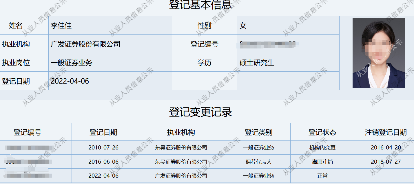 另一位签名保荐人李佳佳于2018年从东吴证券辞职。直到2022年4月,他才再次在证券行业协会注册。注册机构是广发证券。然而,李佳佳的注册类别是普通证券行业和非保荐代表人。