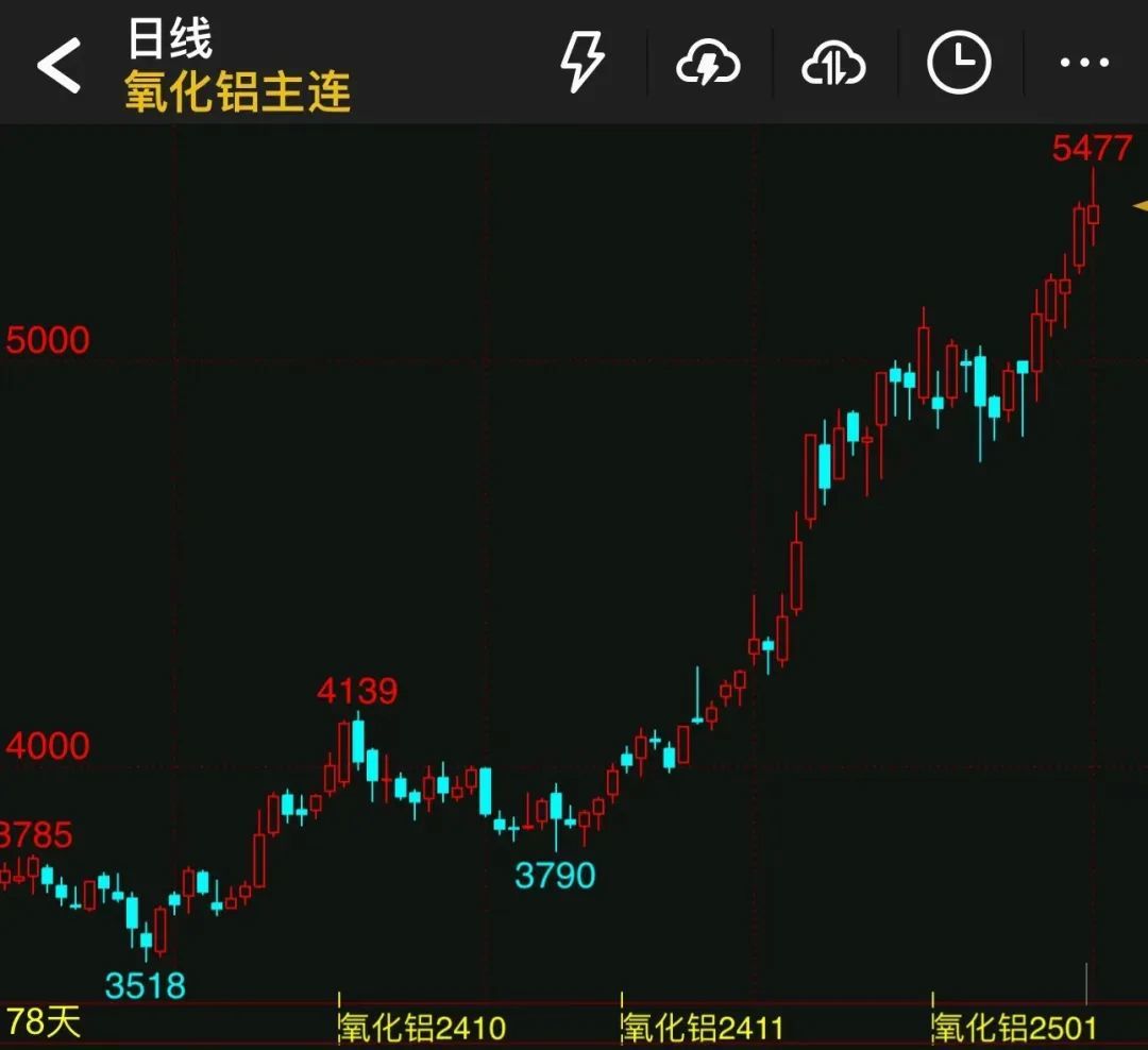 十一月十一日,氧化铝期货主力合约2501再次上涨,最高5477元/吨,续刷上市以来新高。
