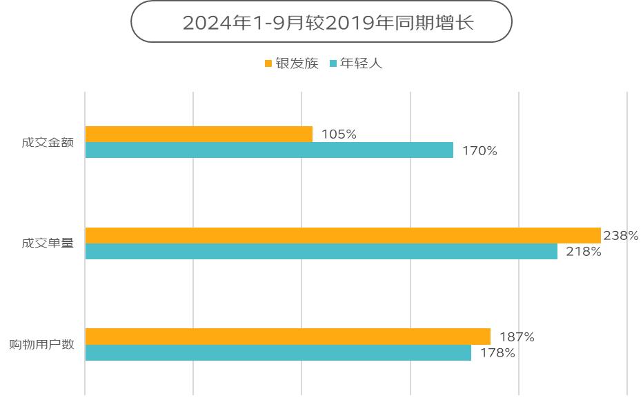 JD.COM的《2024银发族消费报告》也显示,2024年1月至9月,银发族线上交易量、购物用户数、交易量分别比2019年同期增长238%。、187%、105%;银发族的购物类型更加丰富,消费观念不断升级,从基本的衣食住行、家庭保健、数码家电等科技时尚,到家政保洁、搬家货运等服务消费。