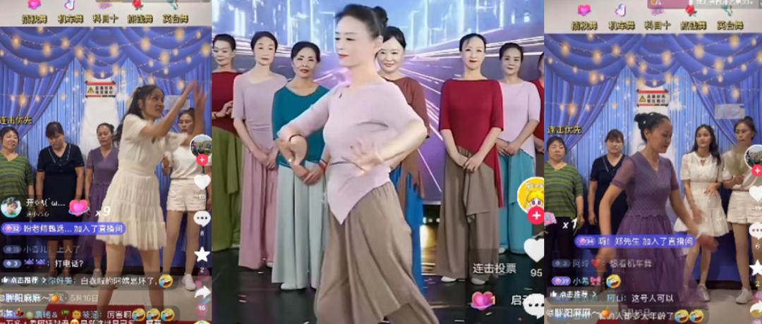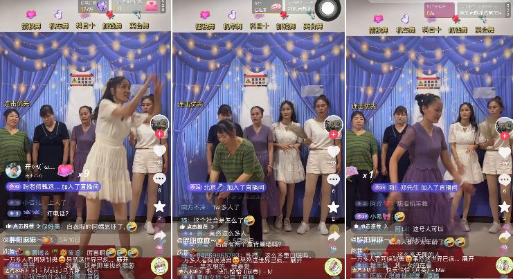 一个热情的直播间,4-5个穿着紧身华丽表演服的热情阿姨,伴随着“洗脑再上头”的音乐节拍,他们轮流在直播中表演英语台舞、插秧舞、抓钱舞、摩托车舞、十大学科。...在直播间最高观看人数突破万人!