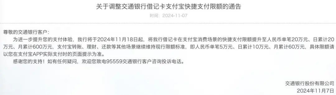 近日,交通银行官网发布关于调整交通银行储蓄卡支付宝快速支付限额的通知。根据通知,为了提升客户的支付体验,从2024年11月18日起,将交通银行借记卡在支付宝消费场景中的快速支付限额提升至每笔20万元、每日累计20万元、每月累计600万元。