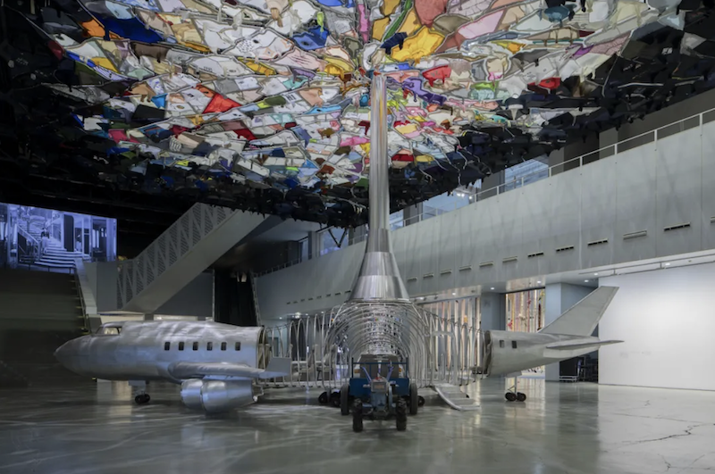 展览以大厅里同名设备“刺天”拉开帷幕,该装置由三部作品组成:飞机、刺天、补天。《飞机》是第七届上海双年展《快城快客》的作品。与之相连的《刺天》突破了现实的维度,用15米长的金属针直接刺穿了天空,成为人类探索外太空欲望的具体形象。相比之下,在作品《补天》中,艺术家将前期邀请公众参与捐赠的数千件“天空色”旧衣服缝合在一起,通过神话故事“女娲补天”的形象来修复被刺破的天空。
