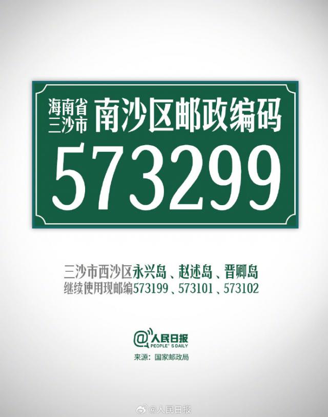 11 月 10 日,国家邮政局发布公告,中国邮政集团有限公司根据邮政编制规则,给予海南省三沙市南沙区邮政编制:573299。三沙市西沙区永兴岛、赵述岛、晋卿岛正常使用现邮政编制 573199、573101、573102。