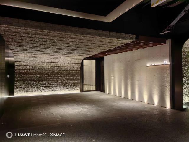 从这个角度来看,车库入口的顶部和路面都装饰着射灯,充分利用灯源增加车库的美感。