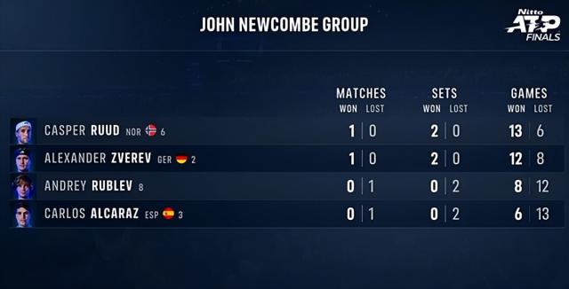 北京时间 11 月 12 日消息,2024 年 ATP 纽康比组年终总决赛第一轮的两场比赛已经结束:阿尔卡拉斯 0-2 大冷被狂扫,职业生涯第一次败给鲁德!兹维列夫 2-0 击败卢布列夫。第一轮结束后,小组排名如下:鲁德第一,兹维列夫第二,卢布列夫第三。被称为冠军之一的阿尔卡拉斯垫底。因为他拿不到一盘,阿尔卡拉斯也会在第二轮提前迎来一场生死大战!