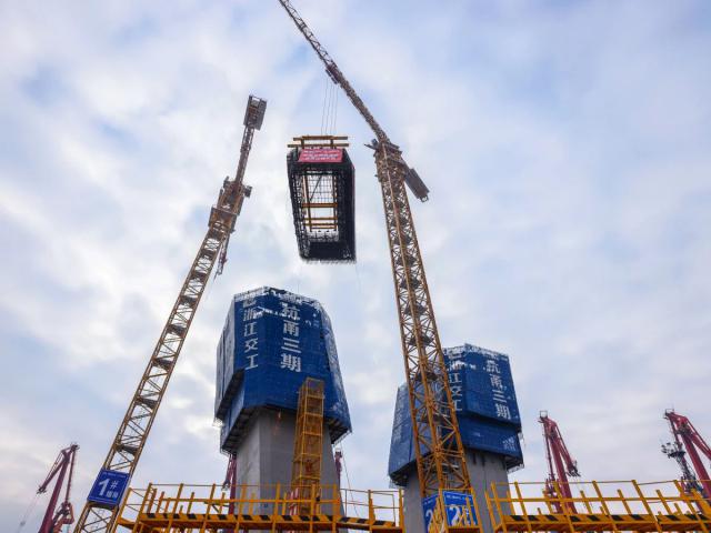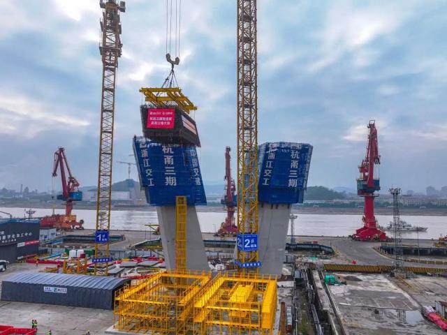 11 月 11 一天早晨,一节重约 67 一吨钢筋被吊装到隧江特大桥。 59 号索塔,并且缓慢着陆,在预定位置精确安装,意味着这个国际跨江大桥全面进入部品化施工阶段。