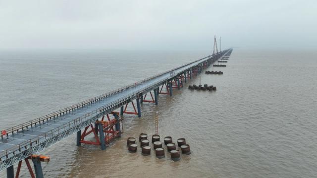 11 月 10 日凌晨 3 时 18 分,随着最后一块桥面的搭建完成,杭州湾跨海铁路桥南海中引桥通苏嘉隧高铁 6.96 公里栈桥顺利贯通,为后续海上各工作面施工奠定基础,意味着桥梁施工进入了一个新的阶段。