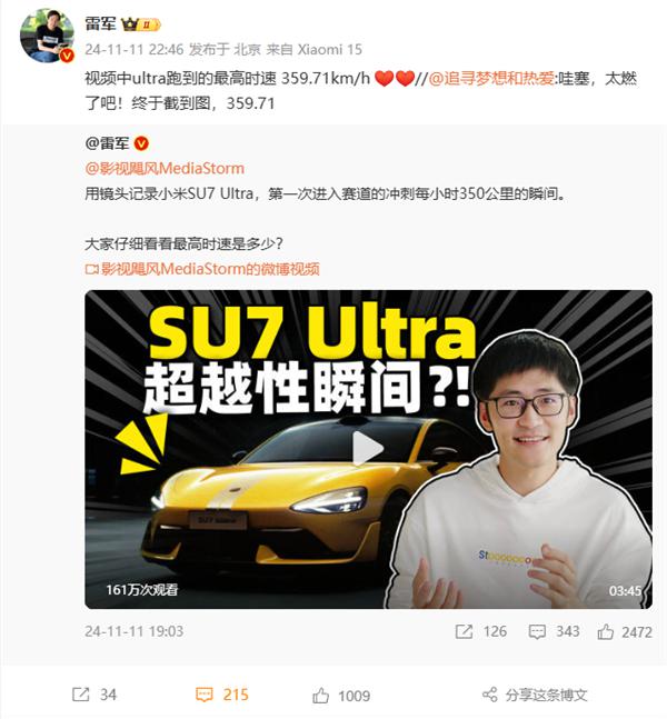 录像显示,小米 SU7 Ultra 最高速度达到了惊人的速度。 359.71km/h,也就是 1 秒钟跑 100 米,这个速度甚至超过了高铁!