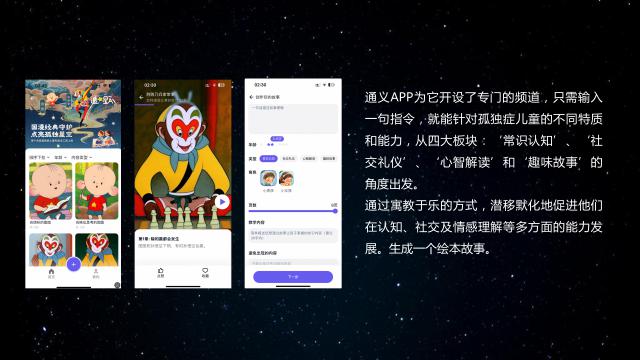 商品技术人员在特殊教育专家的指导下,运用“通义千问” AI 大型模型,针对星宝不同的能力和特点,对四大板块进行分类,常识性认知,社交礼仪,精神解读和有趣的故事。
