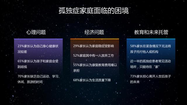 事实上,自闭症家庭面临的困难并不止于此。从现有数据的总结来看,有三个相对典型的心理问题,难以避免的经济压力,以及对当前教育和未来托管的担忧。