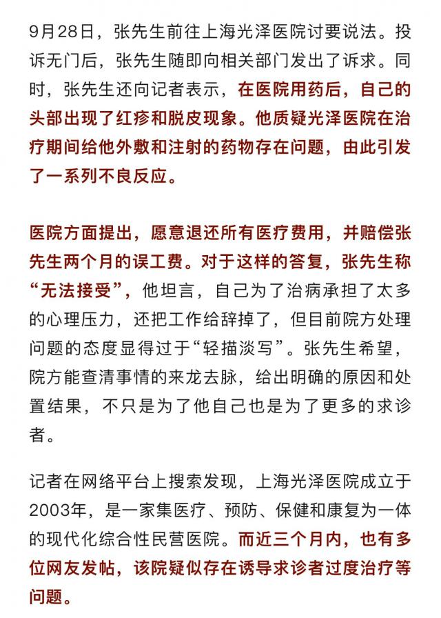 今年张先生说 9 月份感觉身体发痒,极度不适,在网上搜索“诊断和治疗计划”时,他无意中打开了一个链接,发现一些客户服务提供咨询服务。在咨询过程中,客服强烈推荐他去上海光泽医院线下就医。