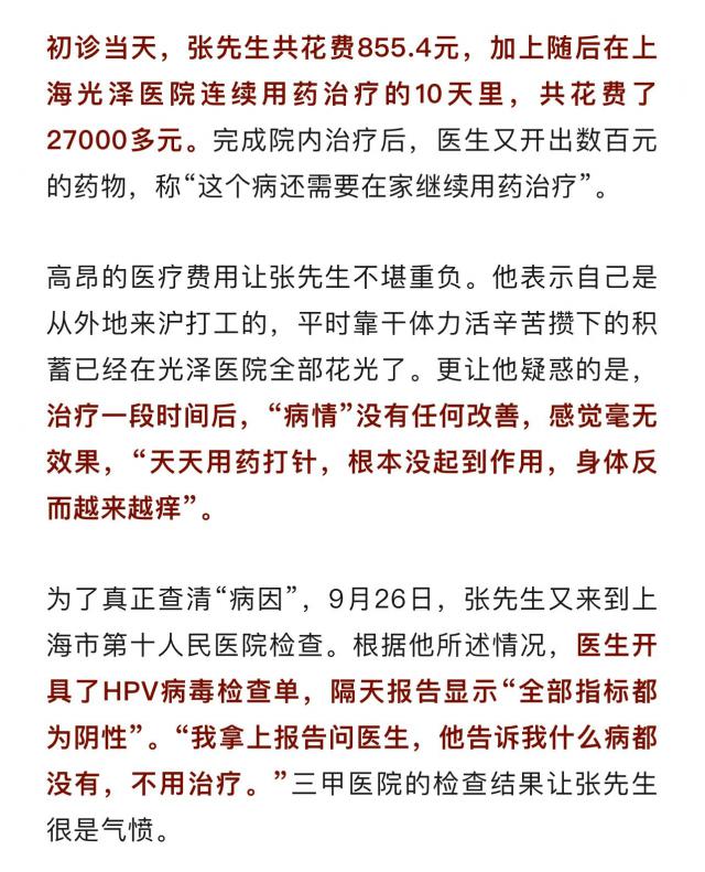 张先生向媒体报道,他在闵行区红松路 154 上海光泽医院号“被诊断出感染” HPV 病毒(人乳头瘤病毒),"看病" 10 天花费 27000 元。