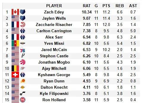 媒体 HoopsHype 晒出赛季到目前为止新秀的评分,详细如下: