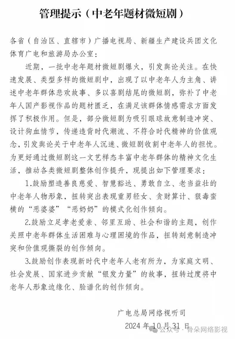 目前,对短剧的监督力度也在不断加强。中老年短剧走红后,各种中老年短剧接踵而至,《清洁妈妈无限归来》《登上法庭》等短剧被投诉涉及软色情等。近日,广电总局网络视听司也发布了《中老年微短剧管理提示》,扭转了离奇荒谬、激化矛盾、丑化老年人形象的创作趋势,鼓励和支持精品创作。