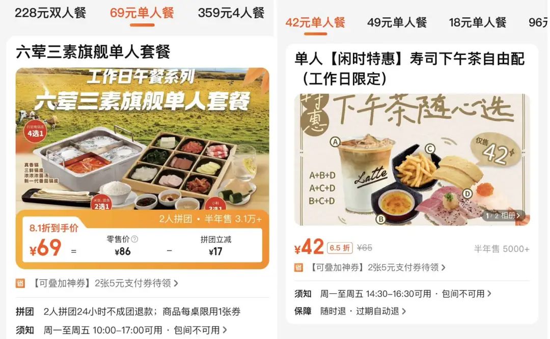 一是推出各种休闲套餐和折扣。比如各大火锅品牌纷纷推出工作日中午套餐。海底捞推出的工作日休闲套餐,六荤三素只需69元。