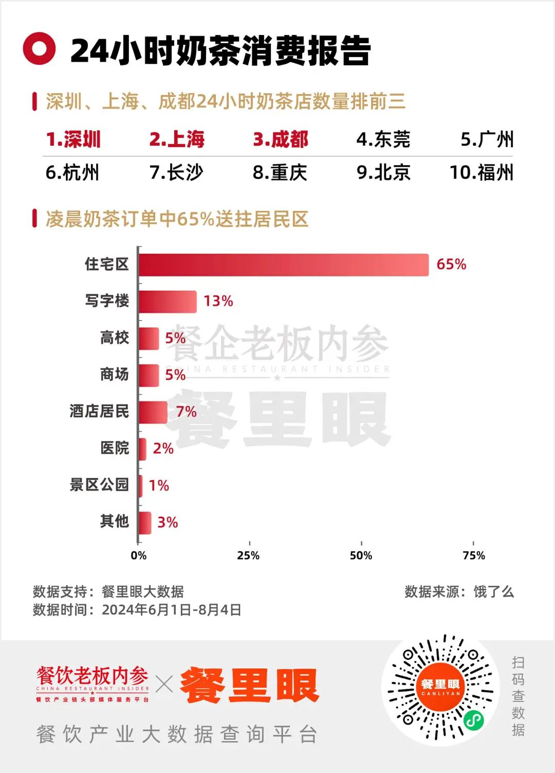 特别是随着外卖的广泛普及,居民区和办公楼对宵夜的需求更加旺盛。根据饿了么平台发布的《24小时奶茶消费报告》,今年6月以来,活跃的夜间经济延长了奶茶店的营业时间。其中,早上65%的奶茶订单被送到居民区,其次是办公楼。
