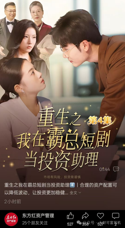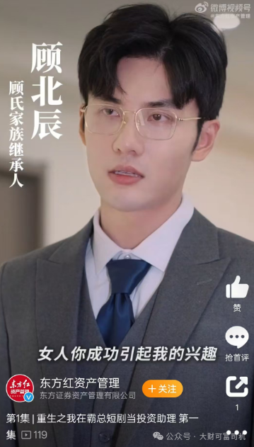 近日,东方红资产管理推出的重生微短剧在朋友圈刷屏。这部短剧于11月6日开播,第一集刚刚开播,女主角秋月重生穿越到顾氏家族企业担任投资助理,不小心撞上了迎面而来的顾氏家族企业继承人顾北辰。