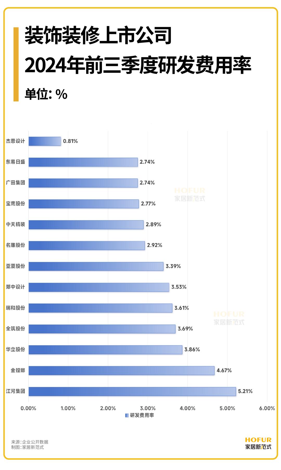 郑中设计的R&D费用率为5.21%;东易日盛、杰恩设计的R&D费用率为4.67%、3.86%;虽然华立股份的收入规模在13家企业之间,但前三季度的R&D费用排名第四,达到3.86%。