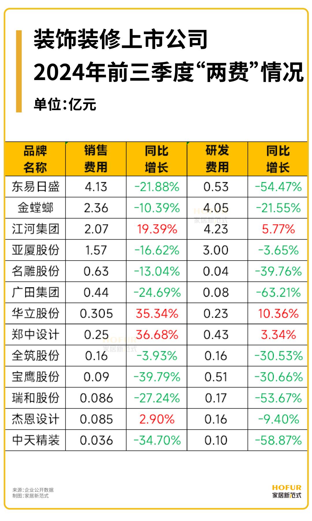 受房地产变化等影响,建筑装饰市场已进入存量竞争阶段,行业发展呈现整体放缓趋势。 日前,建筑装饰公司第三季度报告陆续发布。数据上,每个家庭都很开心,每个家庭都很担心。每个企业的收入表面都有不同的增长或下降趋势,纯利润表面也有不同的三位数增长和三位数下降。 在业绩变化下,建筑装修人员对销售费用、R&D费用等进行了一定的调整,进行了更加精确的成本投入,促进了成本的降低。