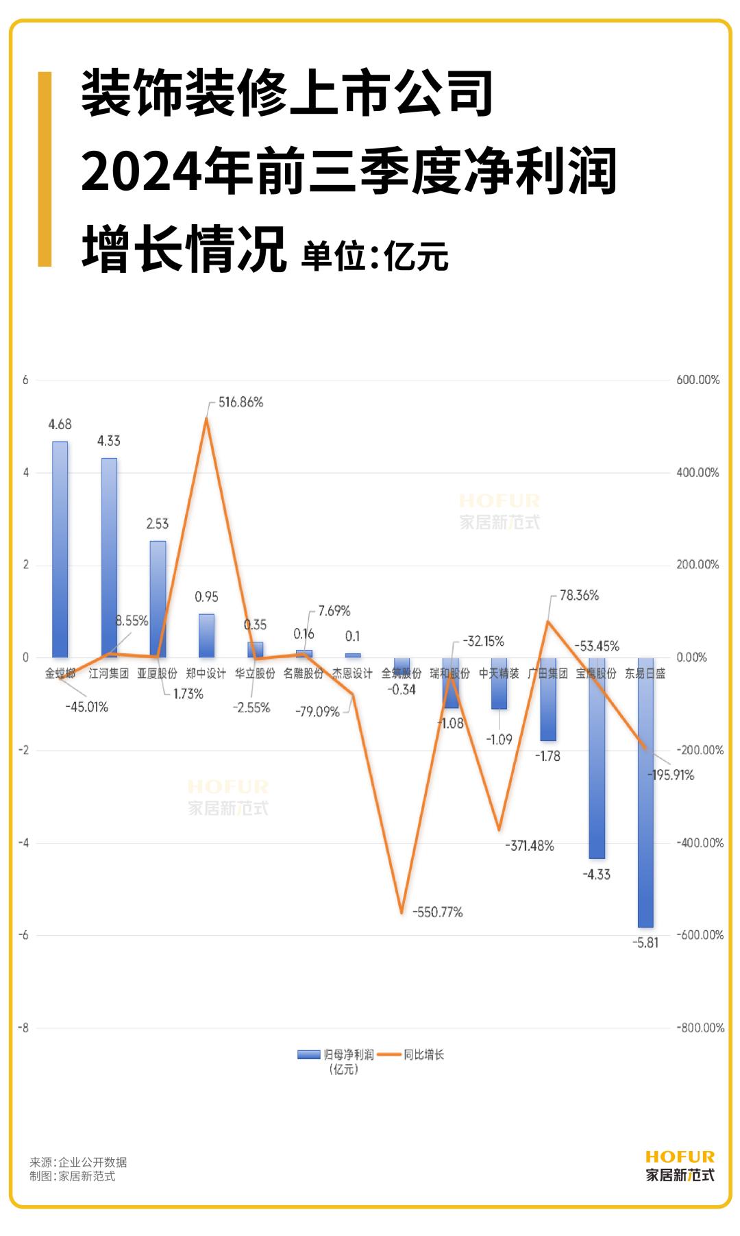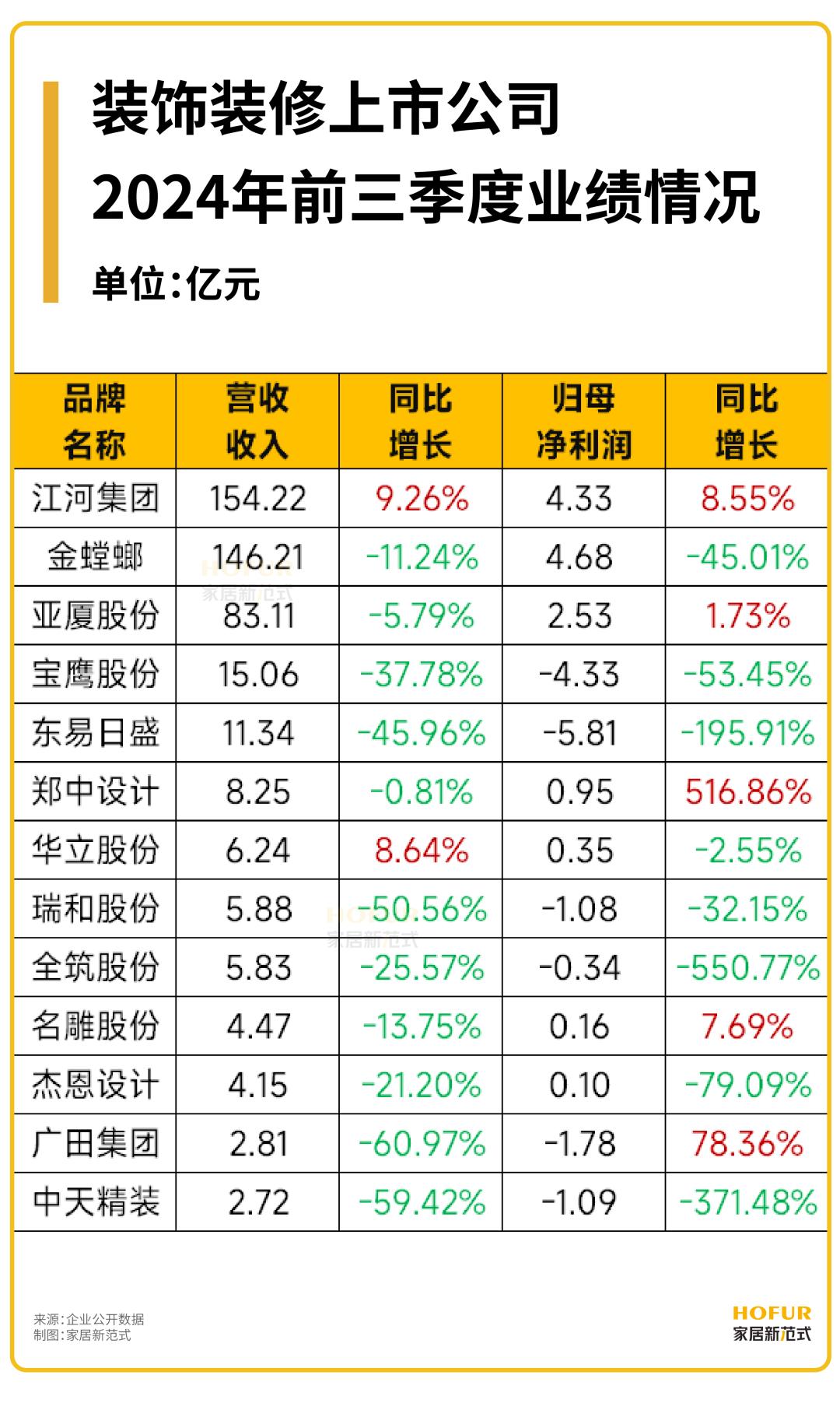 近日,13家建筑装饰上市公司披露了2024年前三季度的经营情况,其中多家公司的业绩呈现收入和负净利润增长。根据新家居范式统计,只有江河集团营收和净利润双增,华立股权增收不增利。,另有四家企业增加利润不创收,七家企业收入,净利润双下降。。