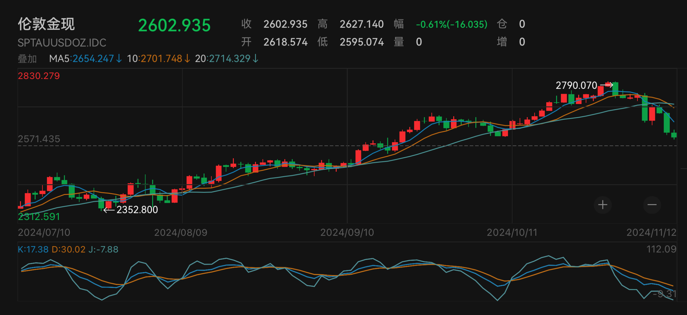 十一月十二日,现货黄金价格持续下跌,一度跌破2600美元关口,这是九月二十日以来的第一次。