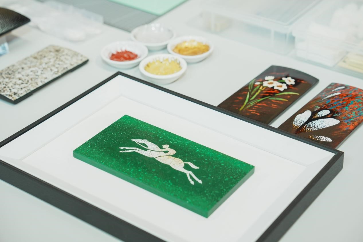 在一张长桌子前,在右边,法国皮革品牌Longchamp龙头工艺师在展示架上整齐地排列着一个竹节扣卡包;左边,上海工艺美术职业学院副教授、上海工艺美术大师蔡文用镊子捡起细碎的蛋壳碎片,用天然漆粘在一块木板表面。