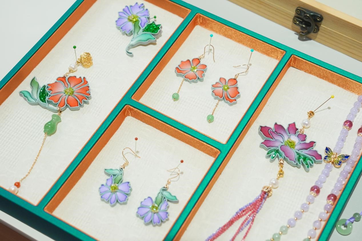 章莉并没有完全照搬依芙德伦的图案,而是结合中国传统审美进行了改造。在耳环的花朵布艺下,她配上一颗青玉珠,取自西方的花朵就有了中式的温婉。他说:“在工艺和色彩方面,我们可以互相借鉴。例如,她们会自己染绣线,得到更多想要的颜色,我认为这是一个很好的方法。章莉觉得只有以开放的态度进行沟通和创新,中法两种工艺才能真正进行对话。事实上,用盘扣生产工艺饰品,也是盘扣工艺的创新。