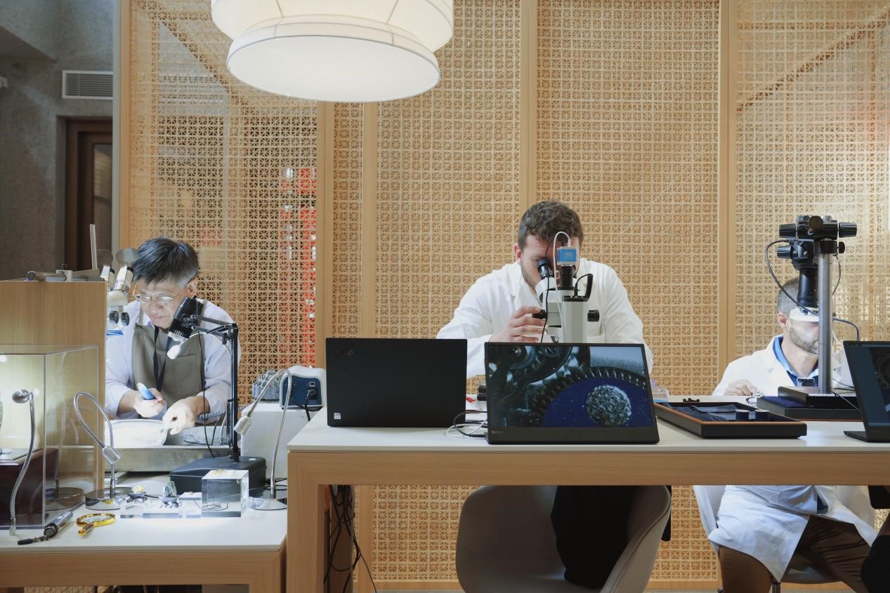 上海工艺美术职业学院邀请工艺大师、海派玉雕国家级非遗传承人、中国玉雕艺术大师袁耀与法国手表品牌宝玑进行对话,因为他首创的俏色翡翠微雕技巧。长桌两侧有三个寸镜,袁耀和法国工匠通过眼镜精密雕刻。