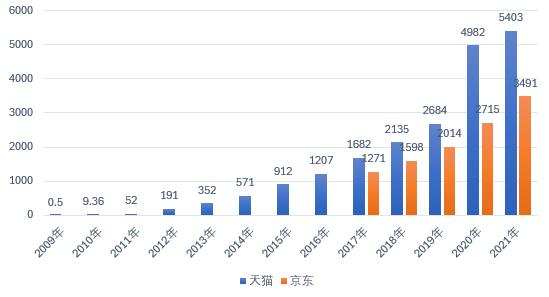 图 1 2009~2021年天猫、JD.COM双11销售额(亿元) 资料来源:根据网络公开资料整理