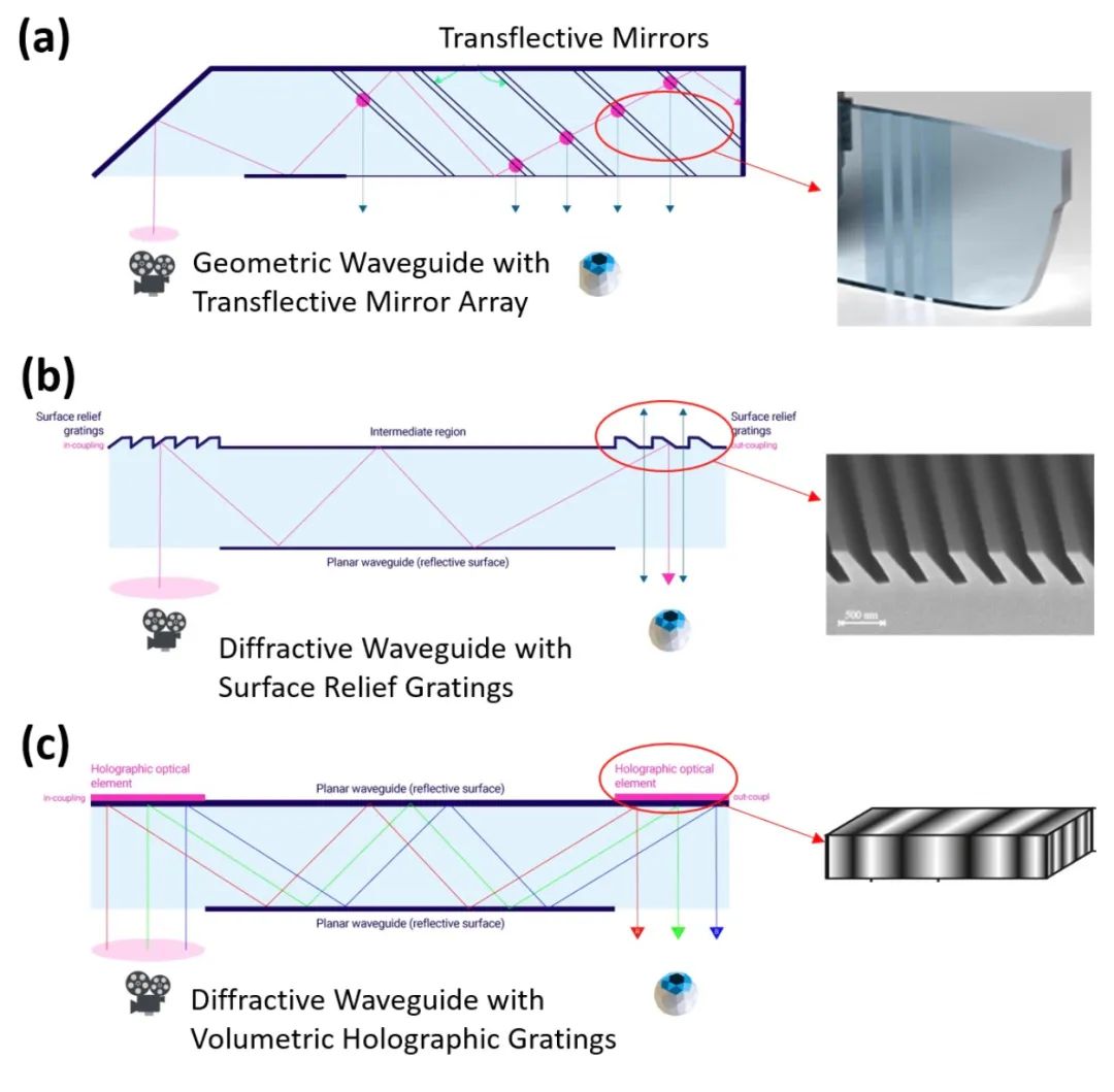 其次,让图像显示的数字内容与现实光“混合”,以某种设计方式传输到眼睛中。这涉及的过程是光传输,实现的部件是光学模块,如BirdBath镜头组合、自由曲面镜头、衍射或阵型光波导。