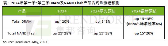 根据TrendForce集邦咨询数据,DRAM合约价格在2024年第二季度上涨至13~18%;NAND Flash 合约价格上涨至15%左右。~20%。