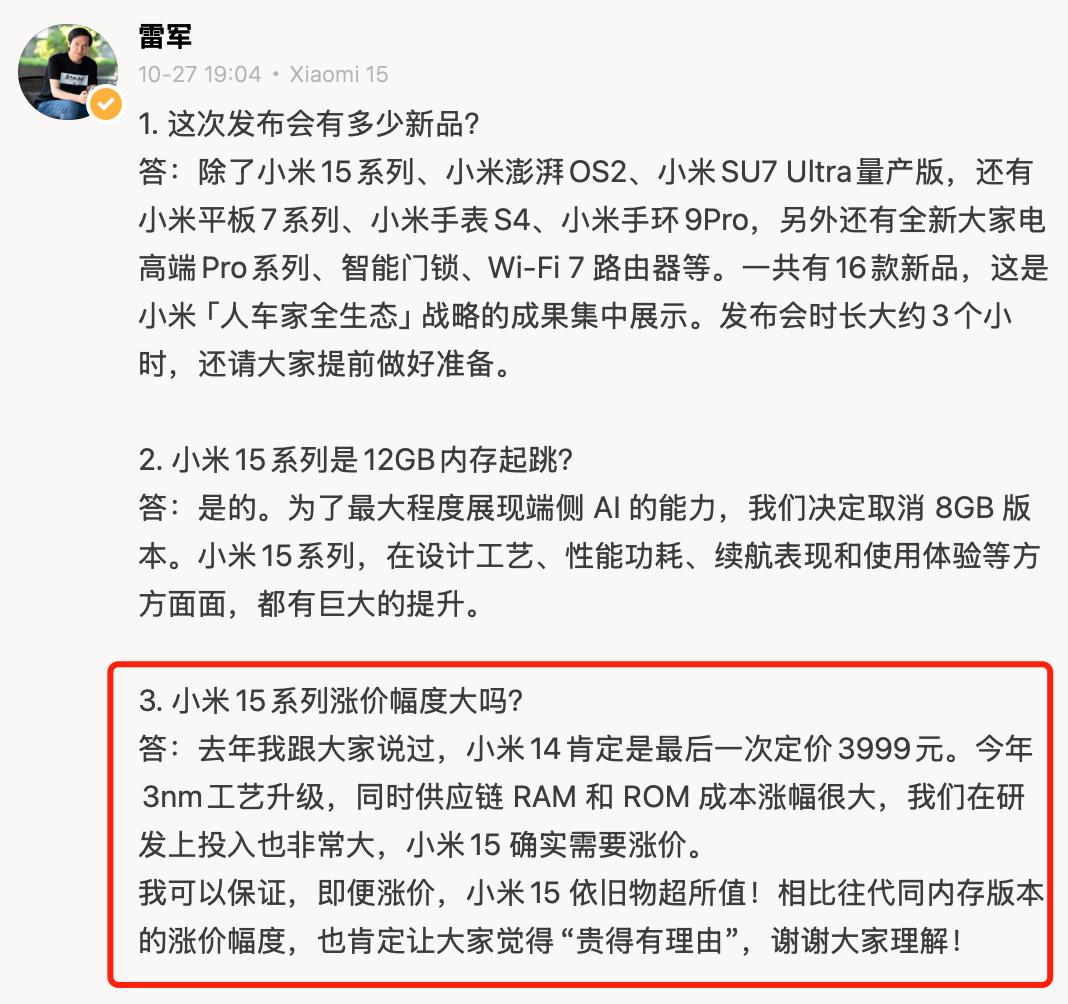 比如雷军说“小米15真的需要涨价”,因为今年元器件成本大幅上涨,小米的R&D投资也很大。