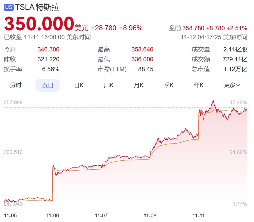 美东时间11月11日收盘,特斯拉(NASDAQ: TSLA)股价站稳350美元,创下近三年以来的新高。自11月5日特朗普赢得美国总统大选后,特斯拉股价持续上涨,从251.44美元涨到350美元,4天里上涨了大约40%。作为本次美国总统候选人唐纳德·特朗普(Donald Trump)的支持者,特斯拉创始人埃隆·马斯克(Elon Musk)在大选后收到了积极回报。