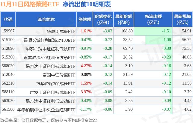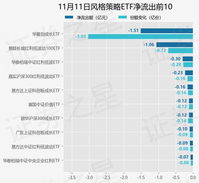 当天有 23 只风格策略 ETF 资金净流出出现在基金中,其中净流出排名第一的是华夏创增长 ETF(159967),份额下降 3.03 一亿份,净流出额为 1.51 亿元。