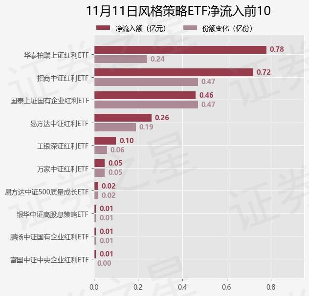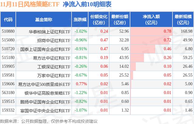 当天有 10 只风格策略 ETF 资金净流入显示,其中华泰柏瑞上交所净流入排名第一。 ETF(510880),份额增加 2450.0 万份,净流入额为 7800.48 万元。