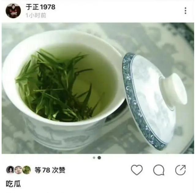 工作室出来澄清是的 p 图片造谣,于正在这风头上发了一条绿洲,内容是吃瓜配绿茶。
