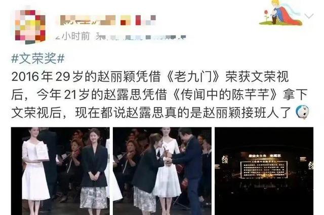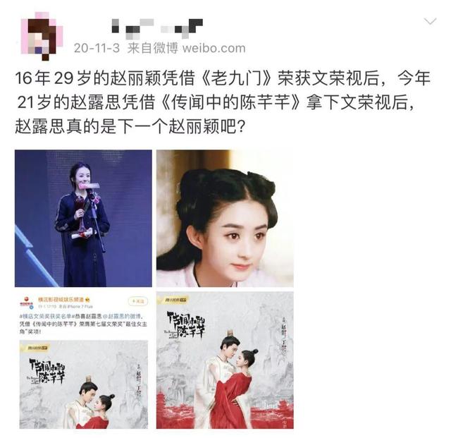 就在赵露思获得文荣奖最佳女主角奖的时候,微博广场上到处都是夸她“小赵丽颖”的营销号。↓
