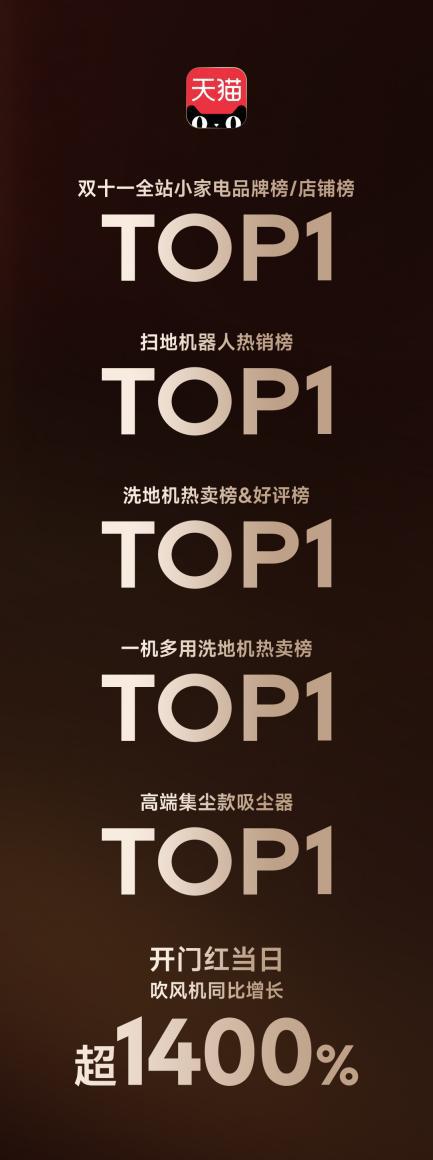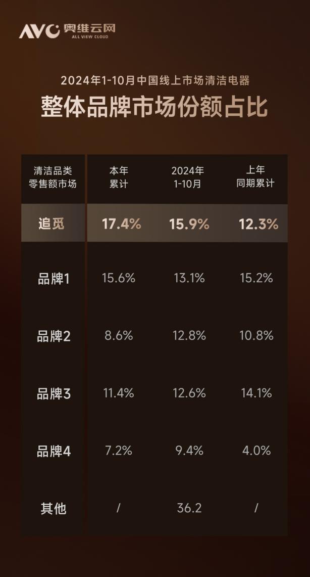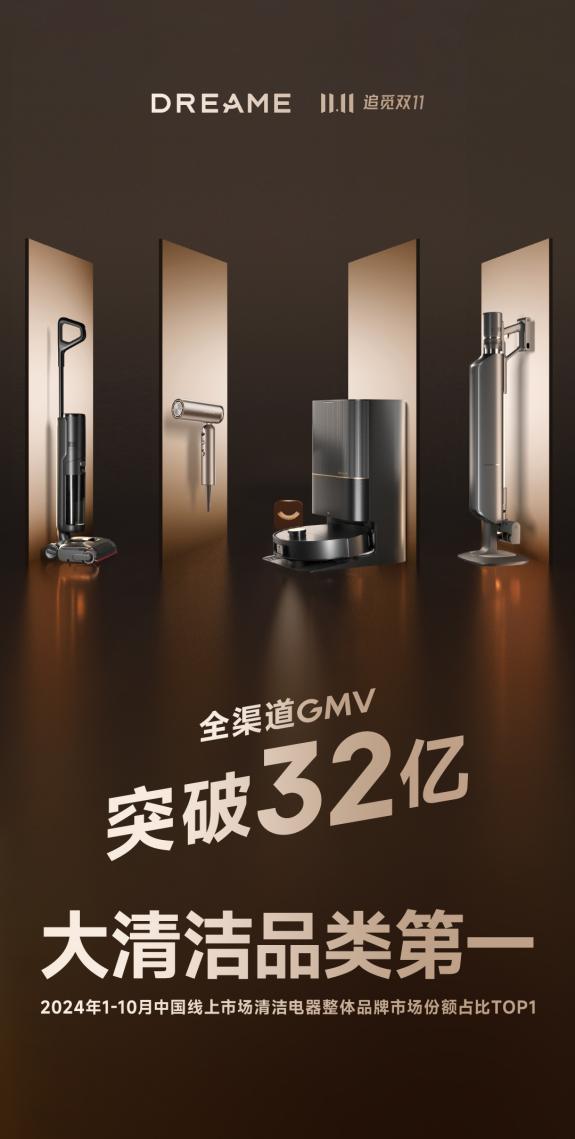 11 月 12 日,追寻科技发布“双重发布” 11 "战况,战况显示,2024 年 10 月 1 日 -11 月 11 日,追寻科技全渠道 GMV 突破 32 另一个依据是奥维云网(AVC)最新数据显示,2024 年 1-10 月份,在中国清洁电器在线市场,追求科技零售的比例达到了 15.9%,稳居行业第一,再一次刷新记录。