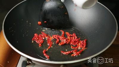 6. 另起锅倒进 3 勺油,微热时将干辣椒小段和花椒放入,转小火慢慢炒。