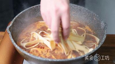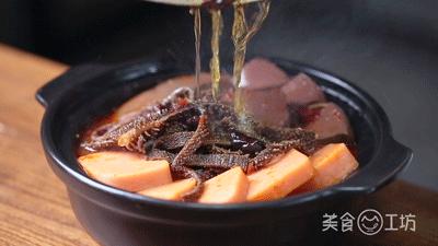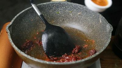 4. 将少许油放入锅中,烧开,将火锅底料和豆瓣酱放入锅中,大火炒至黄酒和清水。