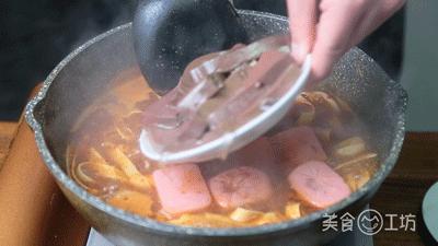 5. 烧开后依次放入千丝、午餐肉、鸭血,煮约。 4 几分钟后放入百叶丝,再煮约 1 一分钟熄火,连汤倒进器皿里。