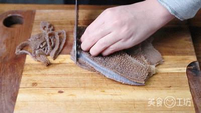 1. 切成鸭血和午餐肉 5cm 切片,黑百叶洗净切丝,葱切碎,葱切葱段。