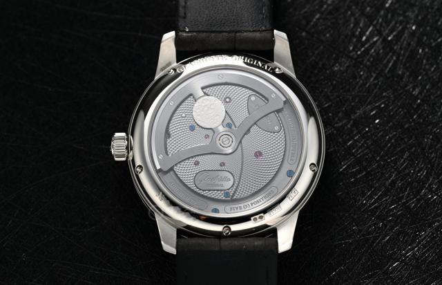 所谓机芯倒置,归根结底就是把机芯倒过来装,这样做最大的好处就是不用摘表就能看到机芯的美。从概念的角度来看,我还是很喜欢这种行为的,但是试穿的时候总觉得有点太直白了。虽然所有作为表盘的饰面都是精心制作的,但可能是因为格拉苏蒂图案作为表盘装饰过于激进,也可能是因为大日历没有外框。反正过度的工业化痕迹让它少了一点精致。于是从 2021 年开始,GO 偏心倒置手表开始雕刻装饰,不得不承认,偏心倒置手表经过雕刻后,确实有脱胎换骨的表现。