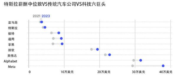 特斯拉员工的薪酬中位数与传统汽车制造商和六大科技巨头相比并不高。数据平台 MyLogIQ 统计数据显示,2023 年度特斯拉员工的薪酬中位数为 4.6 一万美元,仅高于亚马逊。 3.6 一万美元,远低于脸书母公司 Meta 的 37.9 万美金。